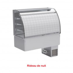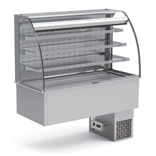 Vitrine murale bombée de distribution avec cuve froide à encastrer - Froid ventilé - Partie arrière fermée - 3 niveaux d'exposition en verre securit - Fermeture par rideau de nuit - Construction inox AISI-304 18/10 satiné - Evaporateur ventilé - Température de la cuve : +4°/+12°C - Vidange intégrée - Panneau de commande amovible avec thermostat digital et interrupteur lumineux - Dimensions encastrement : 1404 x 695 x 760 mm - Capacité cuve : 4 GN1/1 prof. 150
