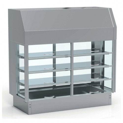 Vitrine réfrigérée à encastrer avec cuve réfrigérée - Construction inox AISI-304 18/10 satiné - Evaporateur ventilé - Température : +4°/+12°C - Cuve totalement soudée avec bords arrondis - Vidange intégrée - Isolation polyuréthane écologique haute densité - Portes coulissantes en verre côté service, clapets battants en méthacrylate côté client - Lumière intérieure basse consommation - Panneau de commande amovible de 1m avec thermostat digital et interrupteur lumineux - Etagères en verre extractibles - Dimensions encastrement : 1500 x 625 x 200 mm - Capacité cuve : 4 GN1/1 prof. 150