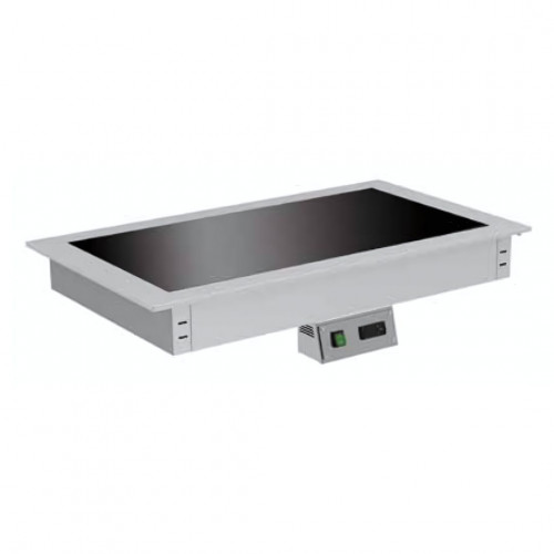 Plaque chaude vitrocéramique à encastrer - Construction inox AISI-304 18/10 satiné - Chauffage par résistances de silicone avec fusible thermique de sécurité - Température réglable par thermostat digital +50°/+100°C - Verre trempé noir vitrocéramique de 6mm d'épaisseur - Panneau de commande amovible - Dimensions d'encastrement : 1745 x 625 x 135 mm - Capacité : 5 GN1/1