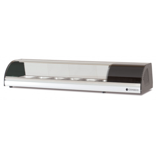 Vitrine à tapas fond embouti (6 bacs GN1/3 prof. 40 inclus) - Extérieur et intérieur en inox AISI-304 18/10 - Lumière LED intérieure avec interrupteur - Thermostat électronique avec afficheur digital - Compresseur hermétique avec condenseur ventilé - Température de travail +4°/+8°C - Dessus vitre courbe en verre securit - Portes coulissantes à l'arrière transparentes - Hauteur : 255 mm - Livrée sur tampons réglables - Ambiance 43°C