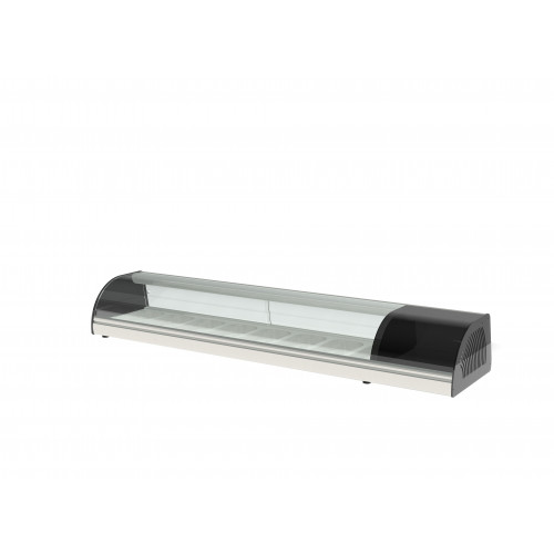Vitrine à tapas fond embouti (8 bacs GN1/3 prof. 40 inclus) - Extérieur et intérieur en inox AISI-304 18/10 - Lumière LED intérieure avec interrupteur - Thermostat électronique avec afficheur digital - Compresseur hermétique avec condenseur ventilé - Température de travail +4°/+8°C - Dessus vitre courbe en verre securit - Portes coulissantes à l'arrière transparentes - Hauteur : 255 mm - Livrée sur tampons réglables - Ambiance 43°C