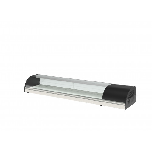 Vitrine à tapas fond plat (pour assiettes) - Extérieur et intérieur en inox AISI-304 18/10 - Lumière LED intérieure avec interrupteur - Thermostat électronique avec afficheur digital - Compresseur hermétique avec condenseur ventilé - Température de travail +4°/+8°C - Dessus vitre courbe en verre securit - Portes coulissantes à l'arrière transparentes - Hauteur : 255 mm - Livrée sur tampons réglables - Ambiance 43°C