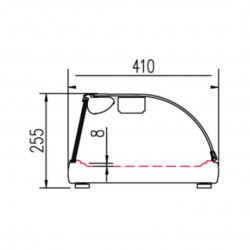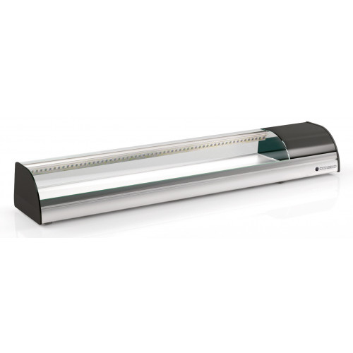 Vitrine à sushis fond plat (pour assiettes) - Extérieur et intérieur en inox AISI-304 18/10 - Lumière LED intérieure avec interrupteur - Double évaporateur statique haut et bas - Thermostat électronique avec afficheur digital - Compresseur hermétique avec condenseur ventilé - Température de travail 0°/+5°C - Dessus vitre courbe en verre securit - Portes coulissantes à l'arrière transparentes - Hauteur : 255 mm - Livrée sur tampons réglables - Ambiance : 43°C